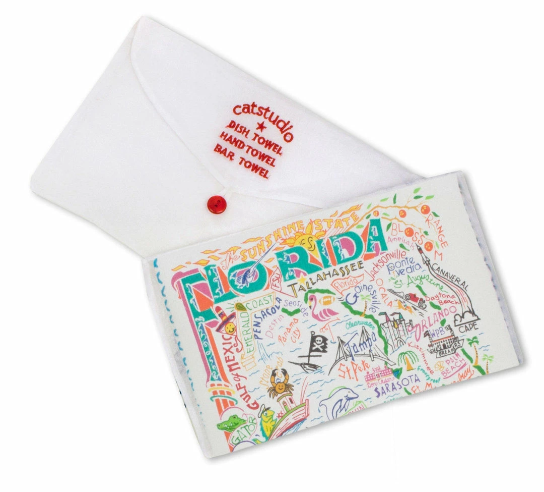 Our original design is printed using the labor intensive hand-swipe silk-screen process with 12 colors (that’s 12 screens used for each towel!). The design is framed with a hand-embroidered border on a 100% hand-loomed cotton towel generously sized at 20×29 inches. Three cheery woven stripes run down both sides and hand-dyed rick-rack at the top and bottom add a charming vintage touch. All this delightfully presented in a fab organdy re-usable pouch ready for gifting!