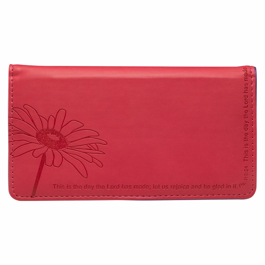 Features a daisy motif debossed into the front of the cover, with Scripture from Psalm 118:24 debossed along the edges on front and back. This pink checkbook cover is constructed of quality man-made material imported from Italy, with the look and feel of real leather (trade name LuxLeather).