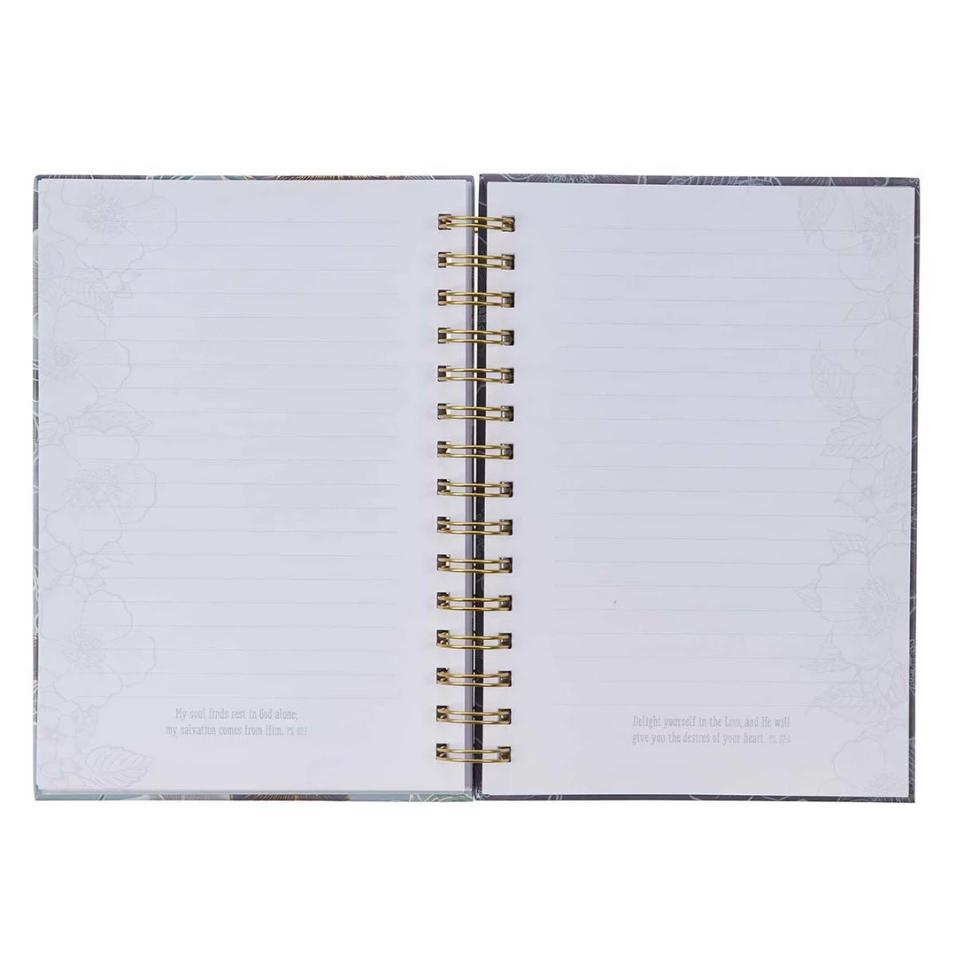The back cover features the outlines of the same floral design in light gray accented with UV varnish. The sturdy gold-toned wire binding complements the gold foiled accents on the front cover. The same floral design is printed as a watermarked border on each page. The 192 pages are all lined, and each features a Scripture verse that can be used as a memory verse or journal prompt. The durable hardcover protects the journal’s pages and prevents any bending or damage to the item. It also provides a sturdy surface for note-taking. A presentation page in the front of the journal allows you to mark the journal with your own name or give it as a gift to celebrate a special occasion.