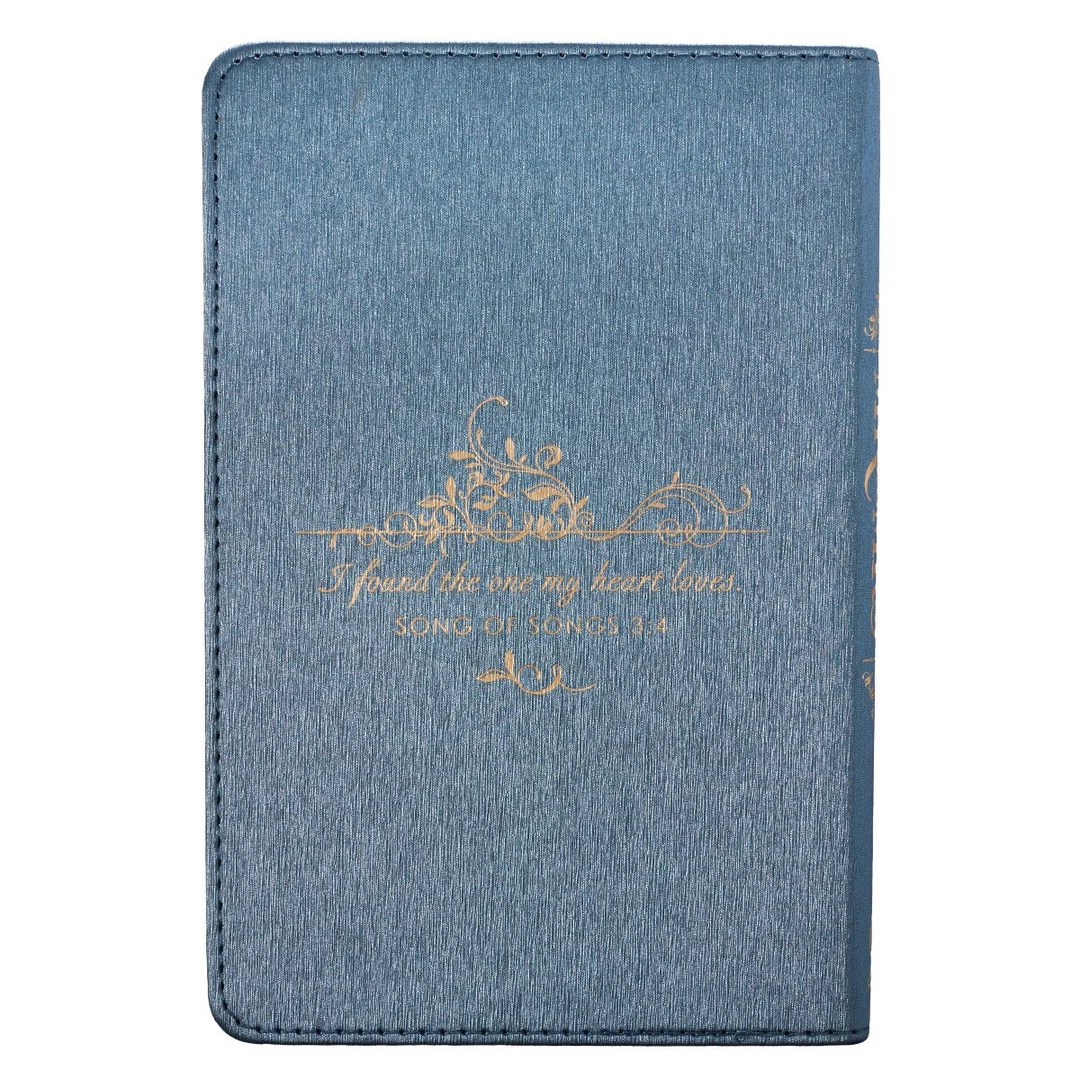 This beautiful blue LuxLeather devotional for couples has a debossed foiled title and gilt-edged pages. It is the perfect size to place on a nightstand, coffee table or bring along with you as you travel together. It has two color insides with a ribbon marker to hold your place. Featuring Song of Songs 3:4, this devotional makes a lovely gift book for newlyweds or couples celebrating an anniversary after many years together. Round off your gift by adding more items from our Mr. & Mrs. Collection.