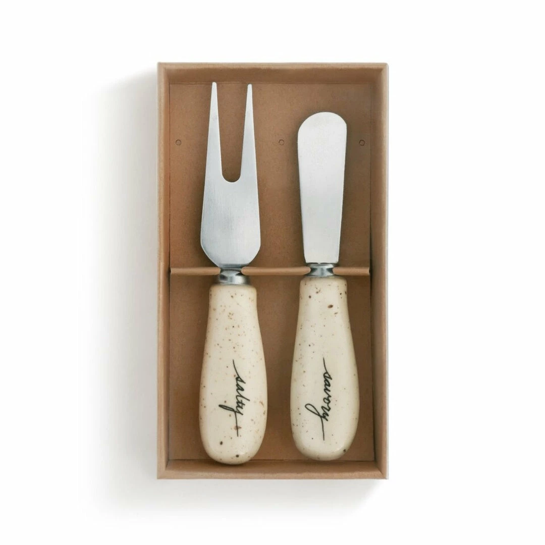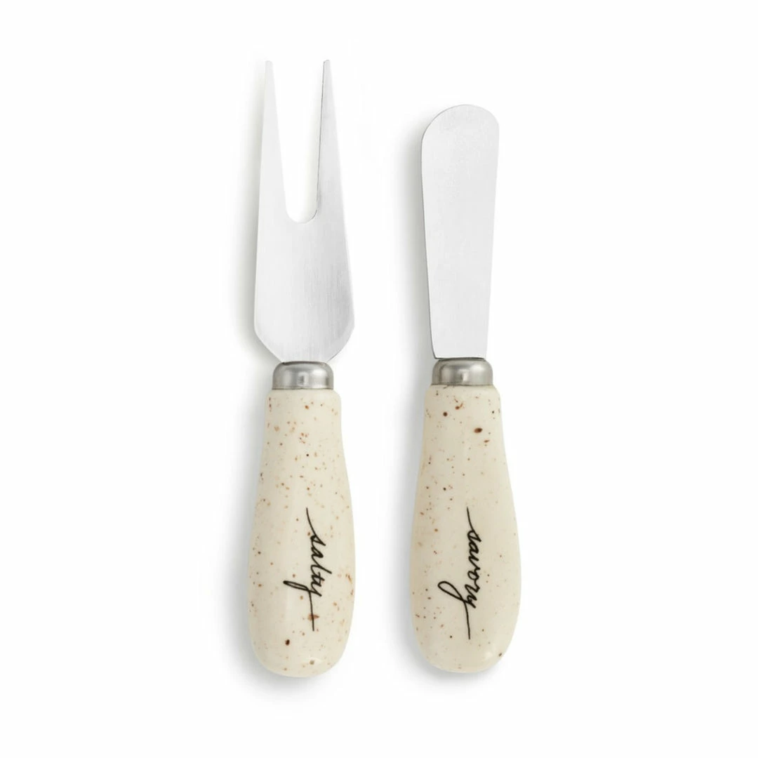 Whether it be cheese, meat, fruits, veggies or other tasty snacks, the Savory Fork and Spreader Set from the byDesign Serving Collection is just what you need to serve up your food in style. Crafted from stainless steel with ceramic handles, this serving set bears the sentiment “Savory” and “Sweet” on the handles. When it’s time to host, spread and cut cheese, sauces, or butter with the spreader and serve bites with the fork in style. Kitchen essentials make great gifts for friends and family that will use them often and be reminded of you every time they do. Gift this useful set for wedding presents, birthdays, the holidays, housewarming gifts or as a special surprise when they’re not expecting it.