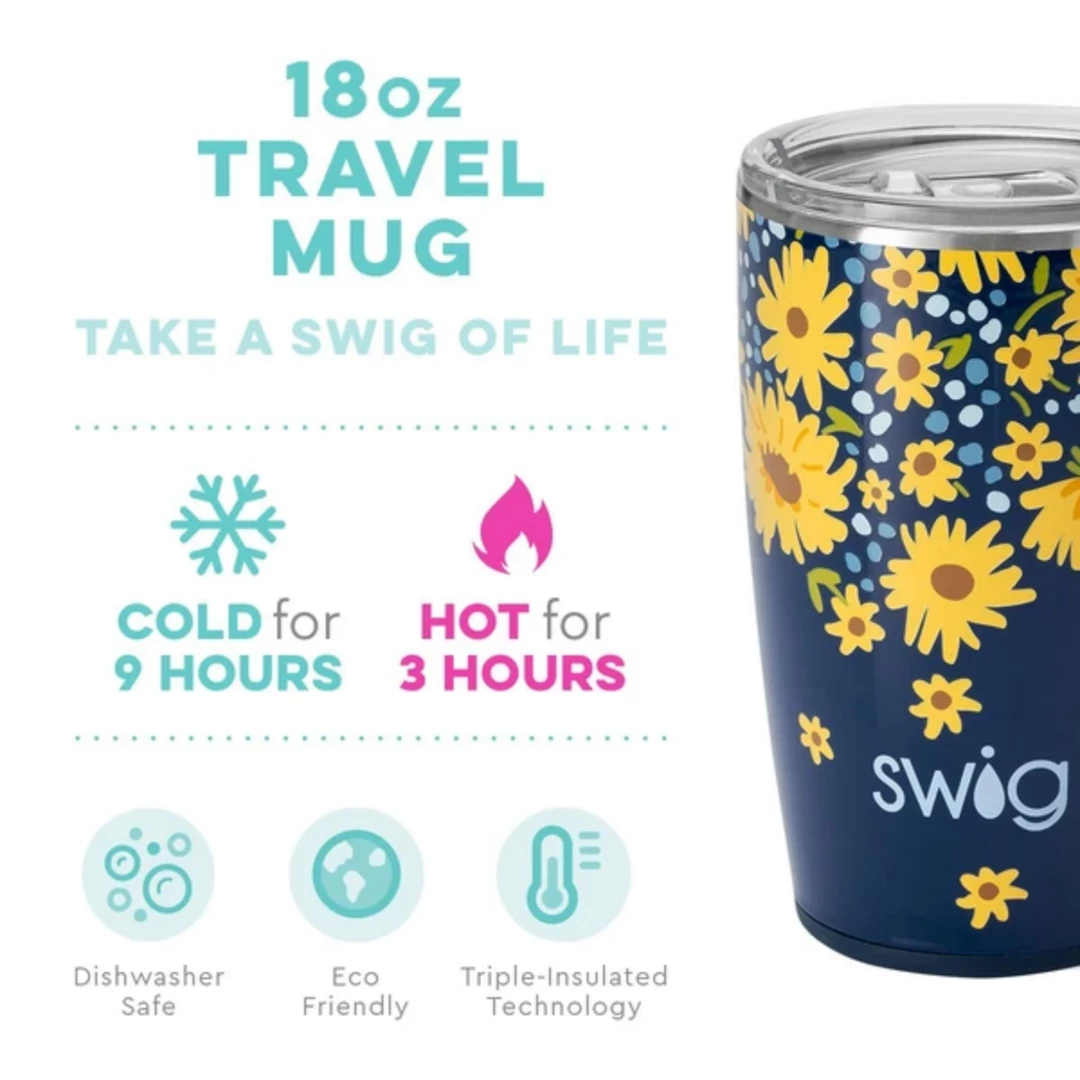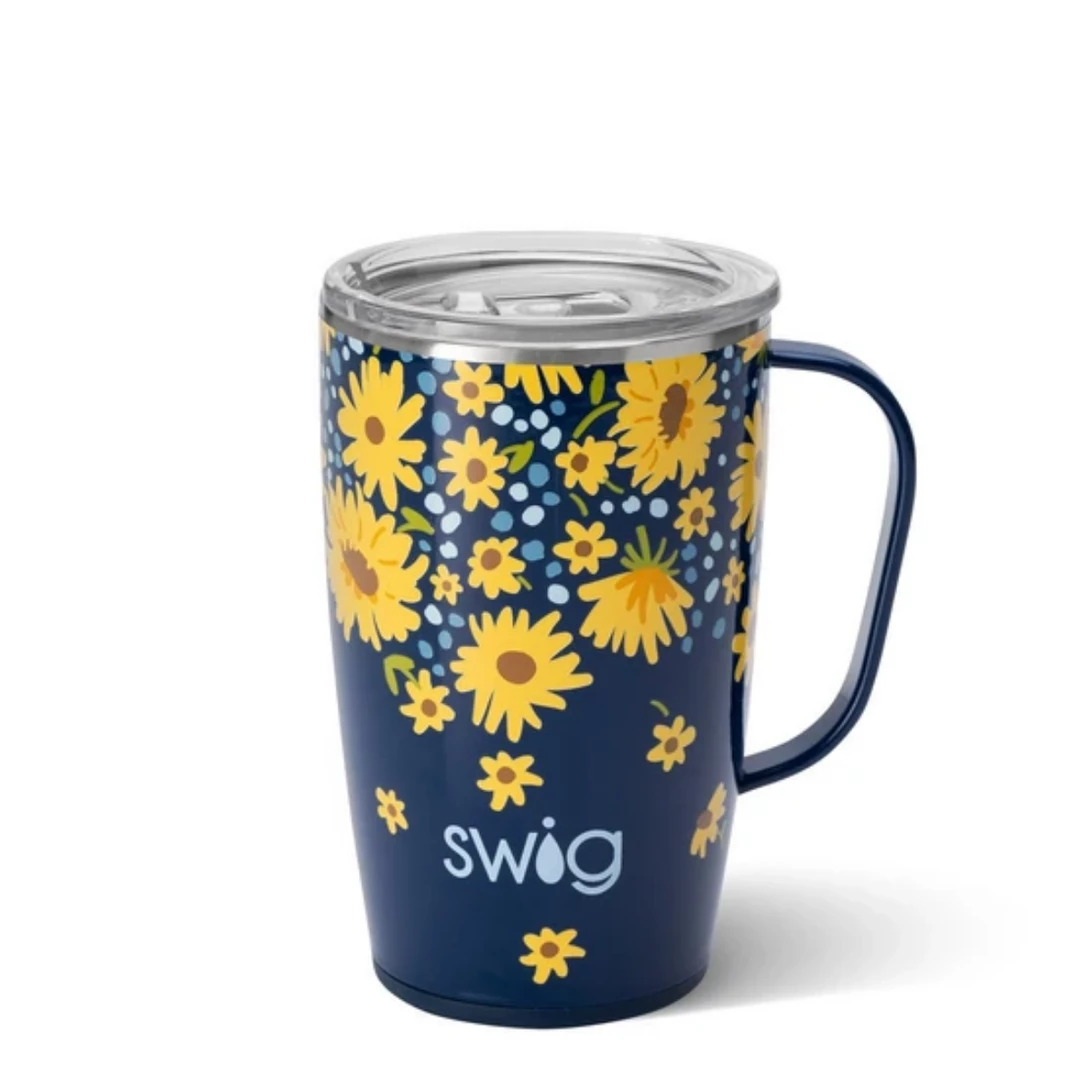 Hello, sunshine! Whimsical flowers and baby blue details bounce across the deep, navy hue of Lazy Daisy.ย Thanks to our triple insulation technology, our best selling travel mug with handle keeps drinks cold up to 9 hours and hot up to 3 hours. The cup holder friendly shape makes it the perfect travel companion, to and from the classroom, the conference room or even just your living room!