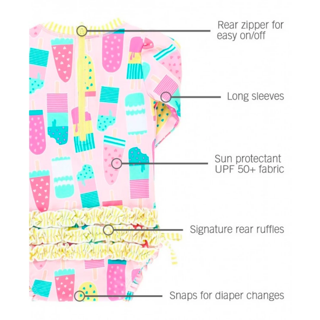 Ice cream swimsuit on a hot summer day? Yes, please! Ice cream in the summer isn’t only fun for eating, but also for wearing. Keep the summer water days fun with this ice cream print one-piece rash guard that offers protection from the sun with UPF 50+ sun protected fabric.