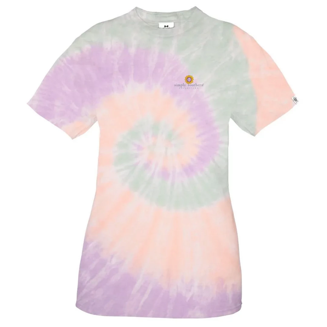 Green; purple; and peach swirl tie dye short sleeve shirt with a blue flower pattern van with flowers in the back; the phrase “Grow through what you go through”; and the Simply Southern logo on the back. The Simply Southern logo with a sunflower with the SS logo on the front chest.